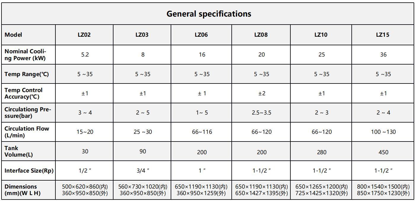 The LZ series split type chiller consists of an indoor unit and an outdoor unit. The outdoor unit consists of a refrigeration compressor, a hot air exhaust fan, and a condenser, which discharge all the heat generated by refrigeration to the outside. At the same time, the main noise source is also located outdoors. The indoor unit consists of a water pump, water tank, and evaporator, which generate no heat and have very low noise.